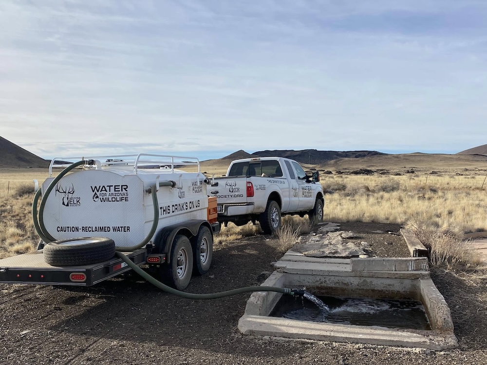 to all wildlife species. Since 2001, AES volunteers have hauled over 4,000,000 gallons of water to drought-stricken areas of elk range and restored and maintained more than 400 wildlife water catchments in Northern Arizona for the survival and betterment of all species of wildlife. The maintenance and filling of water catchments for Arizona’s wildlife remain a top priority of AES.