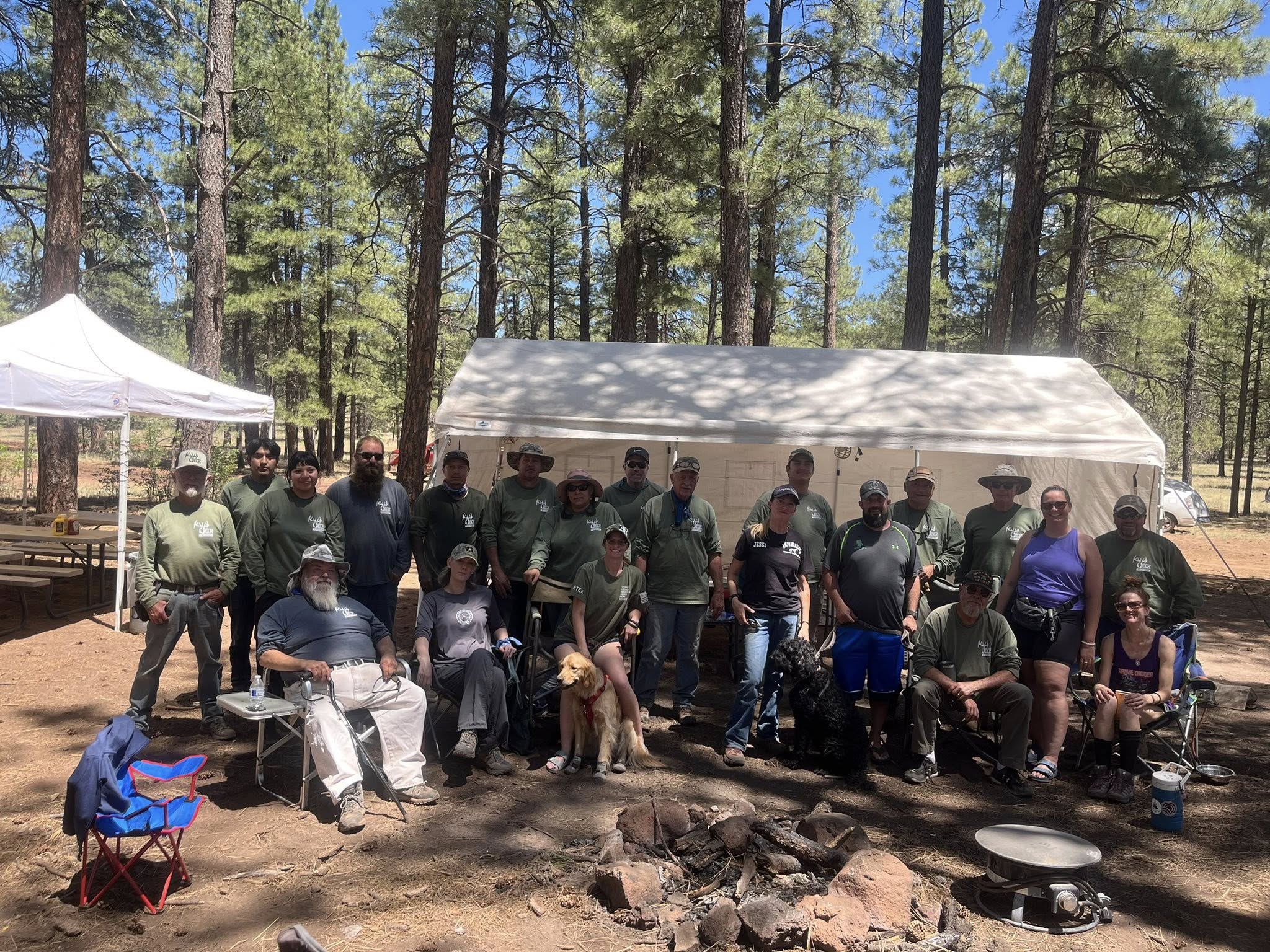 On Friday, August 1 the Arizona Elk Society returned to Apache Maid to continue work on the log worm fence. We had 8 volunteers show up on Friday to help us out. We set up camp 526732637 1163243065838790 171082913376798042 nand then went out to the project site to get started on the work. We decided to not build any fence on Friday, but instead to move logs that were left over to the end of the project in case we needed more further down the line. We also decided to build some tabletops, which is essentially the bottom of the fence. After 6 hours of work, we headed back to camp and grilled up some burgers for supper, and in addition cooked some French fries for the first time ever at a project. This past weekend, we had EmpoweRanch joining us led by Jessica Vossfor their annual Veterans campout. As each one of them arrived, we sat around camp for some great conversations.